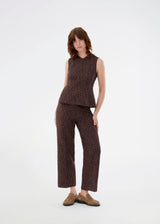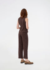 Brown pants with straight legs in a structured material. HollisMD pants have a medium waist with hidden zipper at one side, and two welt pockets on the back.