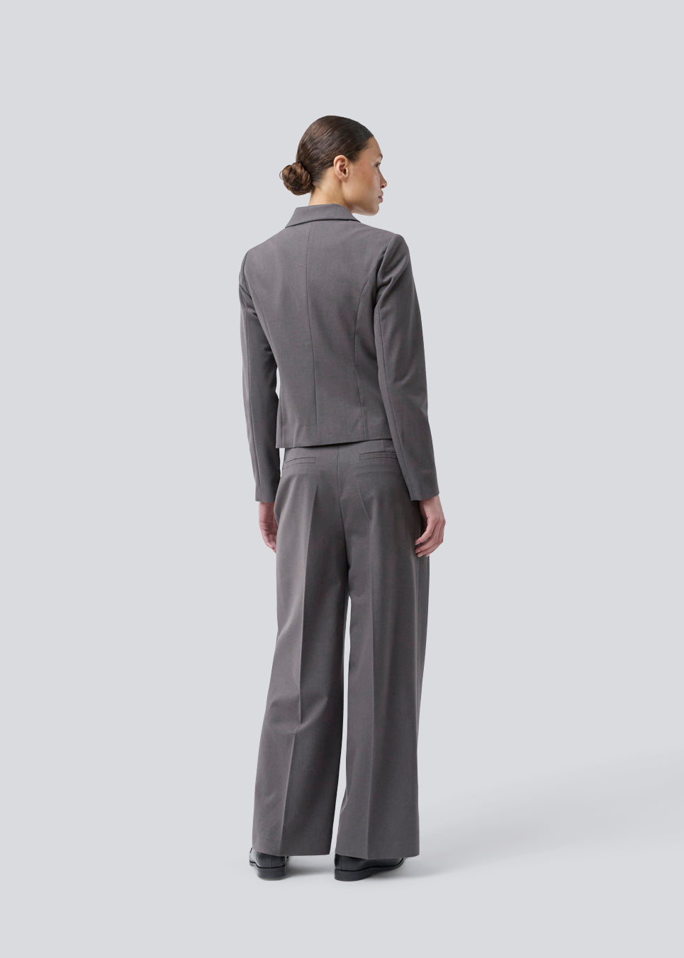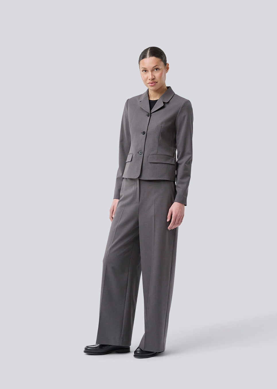 Grey short fitted blazer. Primrosemd blazer has a button closure and two front pockets. The model is 175 cm and wears a size s/36.