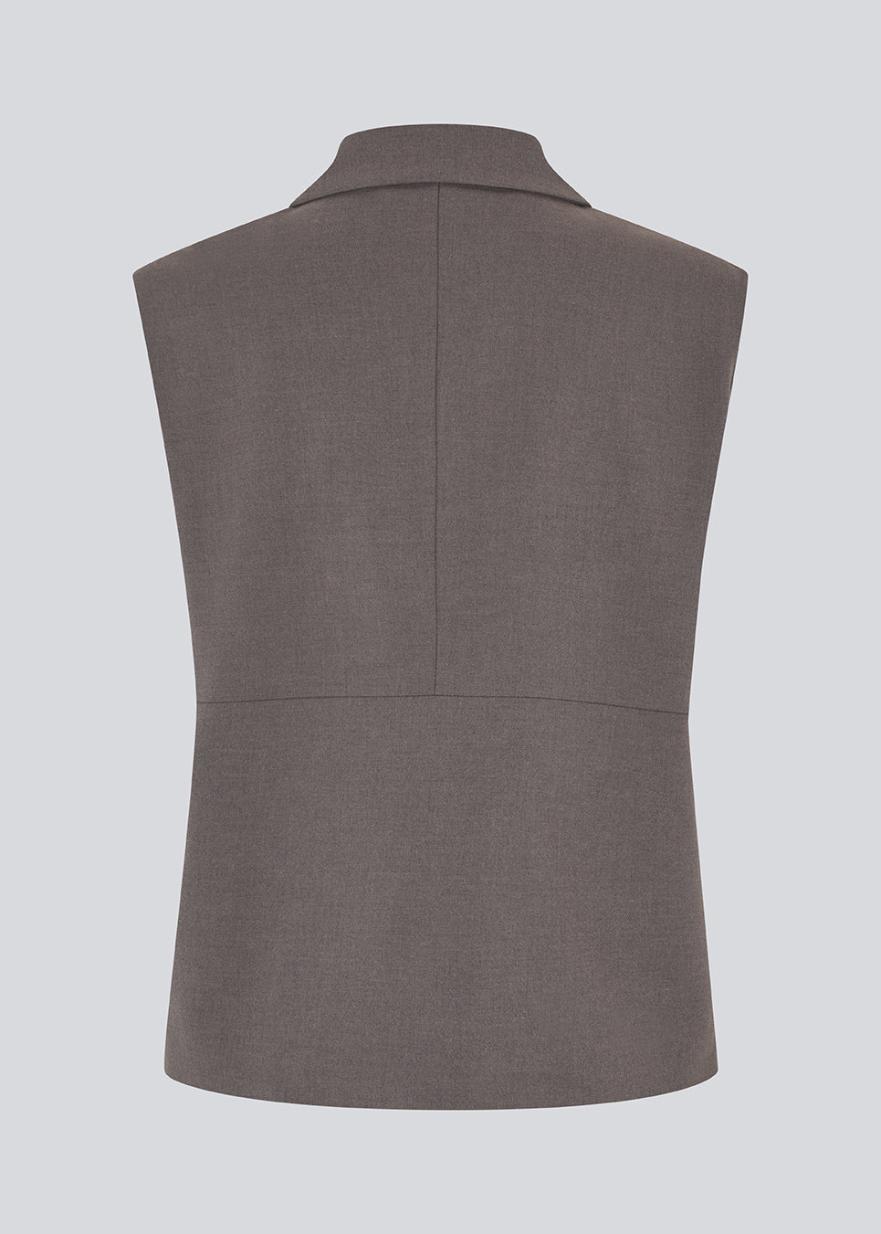 Grey loose vest with a hidden front button closure. Primrosemd vest has a shirt collar and two front pockets.
