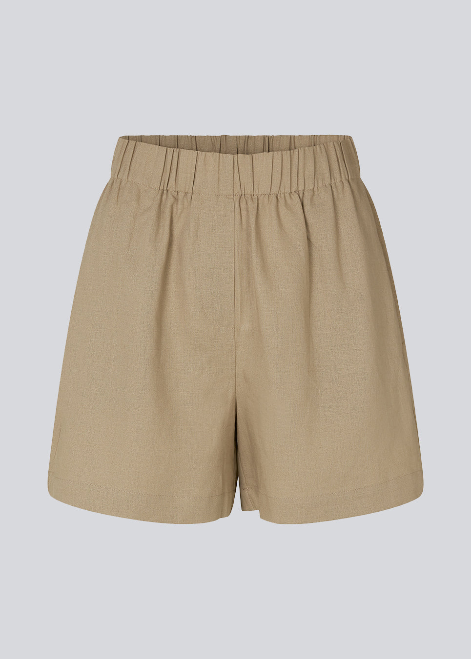 Shorts in the color Dune in a relaxed fit, wide legs, and an elasticated waistband. DarrelMD shorts are crafted from a linen material. The model is 177 cm and wears a size S/36.