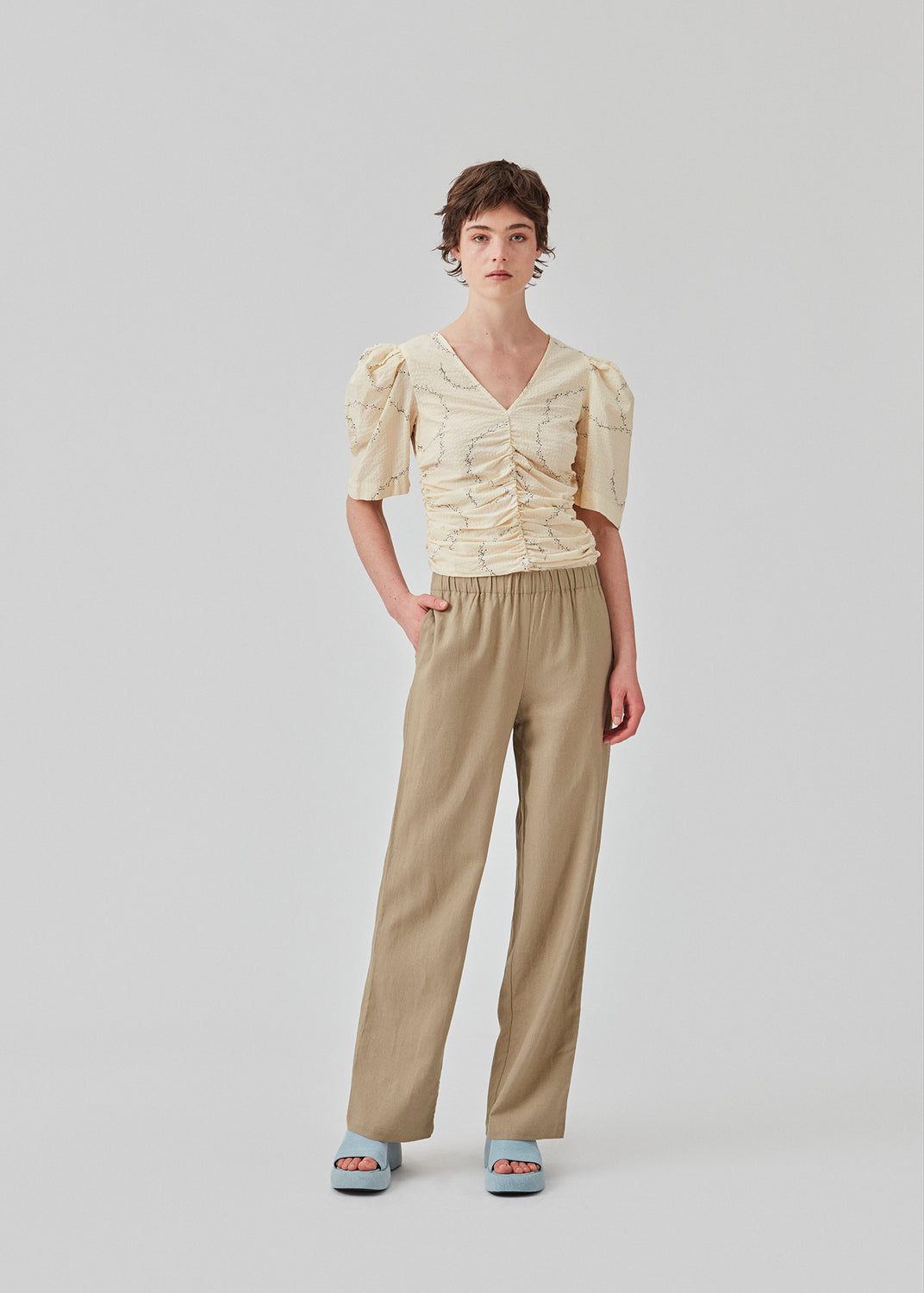 Long pants in the color Dune with a relaxed fit and long wide legs and elasticated waist for extra comfort. TulsiMD pants are made from a soft mix of linen and rayon. The model is 177 cm and wears a size S/36.