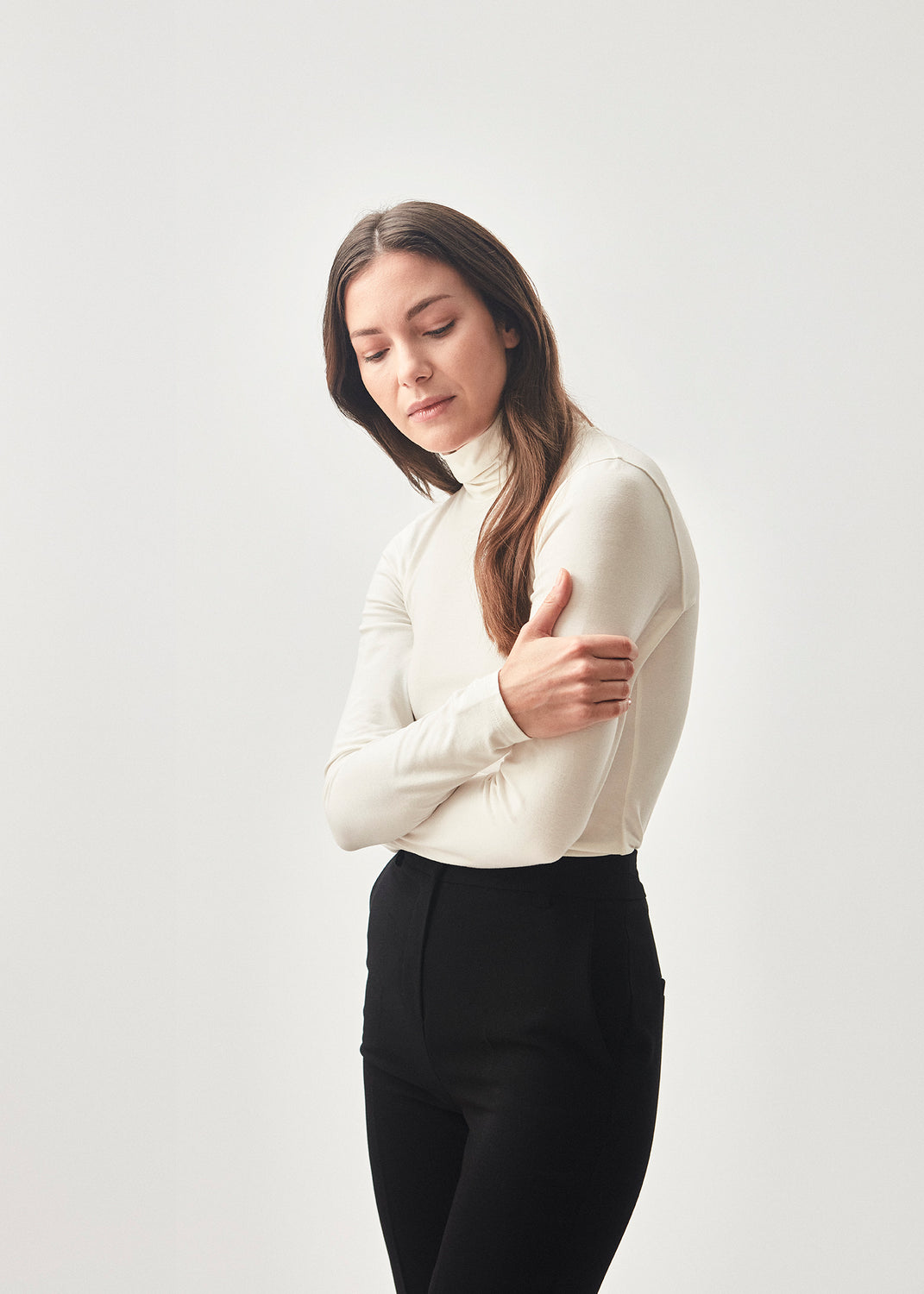 Nice high-necked white blouse in a tight fit, which is perfect for any occasion and a basic must-have in your wardrobe.
