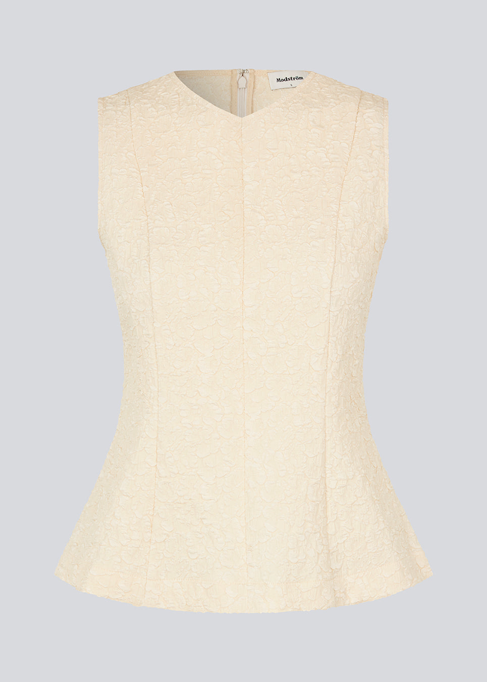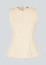 Tailored top in beige without sleeves made from a structured material. HollisMD top has a high v-shaped neckline with a hidden zipper at the neck.