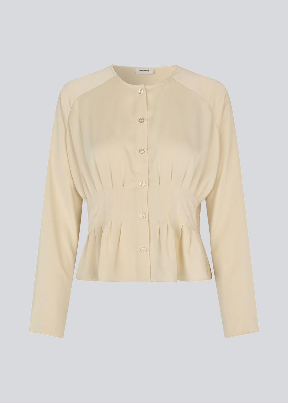 Fitted creme-colored top with boxpleats in satin. LivMD shirt has a button closure in front and loose sleeves.
