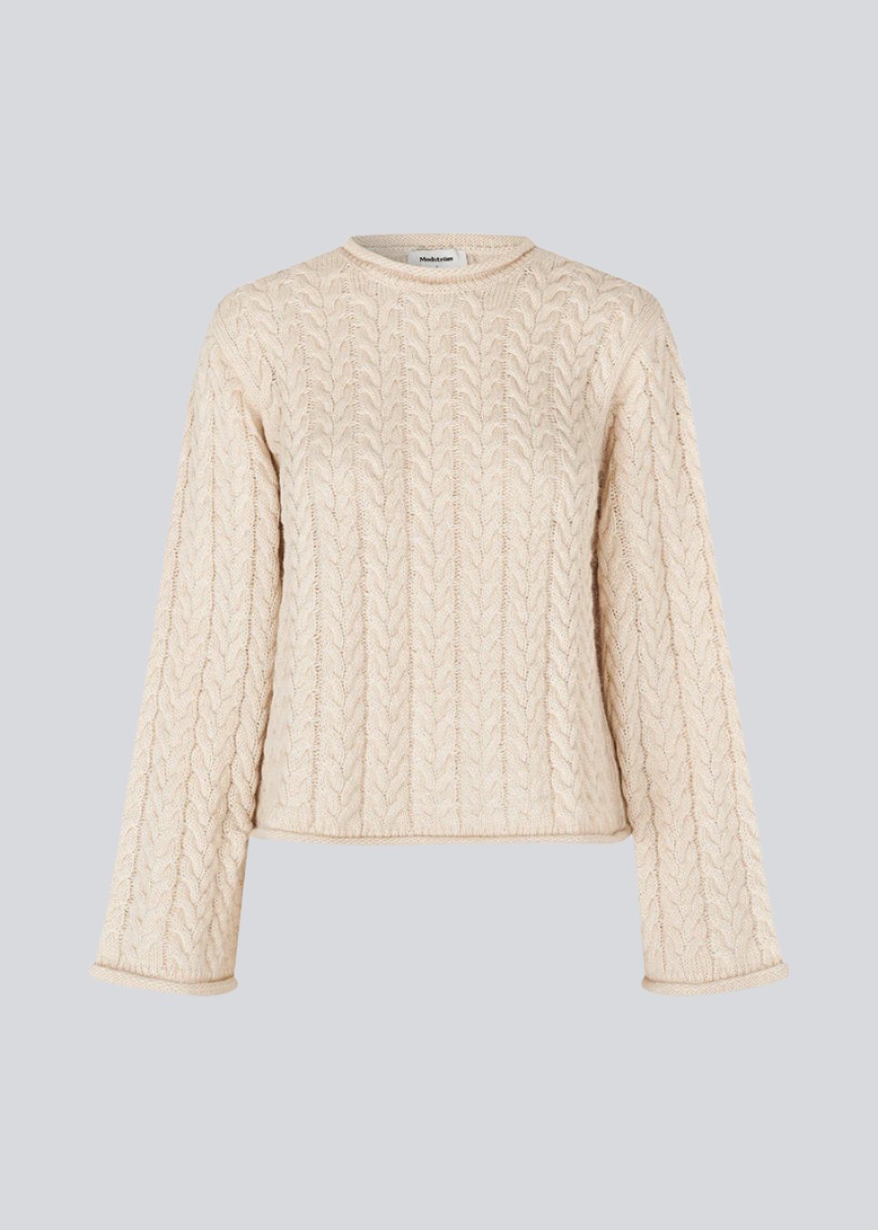 Loose creme wool knit with wide sleeves in cable knit. KurtisMD o-neck has a round neckline and rolled edges.
