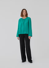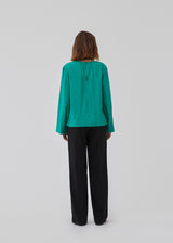 ChristopherMD top in green has a regular body with a round neck with gatherings, and small opening with button closure in the back. Long, wide sleeves. The model is 175 cm and wears a size S/36.