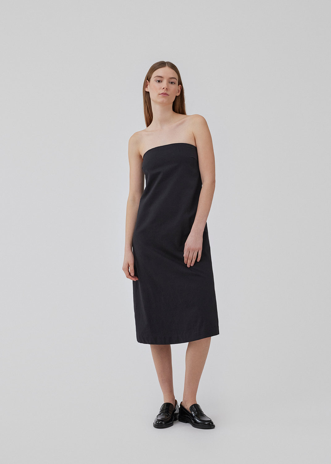 Strapless dress with an A-line shape with midi length. CydneyMD tube dress is designed in cotton with a silicone band at the top, and a hidden zipper at one side. The model is 175 cm and wears a size S/36.