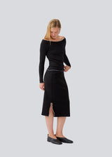 Off-shoulder long sleeve top in black with white edges . MagdaloneMD LS top is fitted and has babylock edges. The model is 177 cm and wears a size S/36.