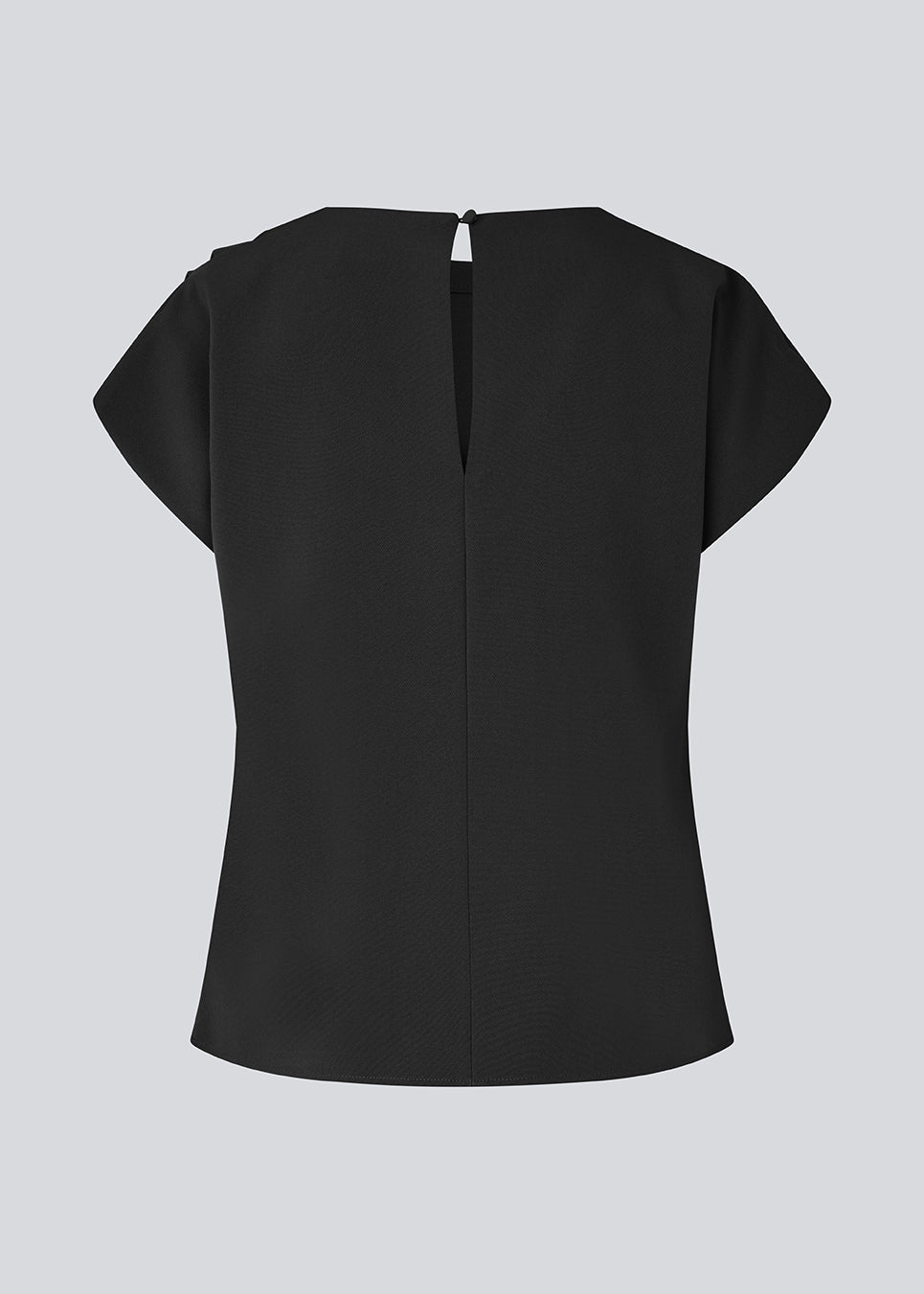 Fitted top with ruffled details. Pandymd top has short sleeves and an opening in the back with button closure.