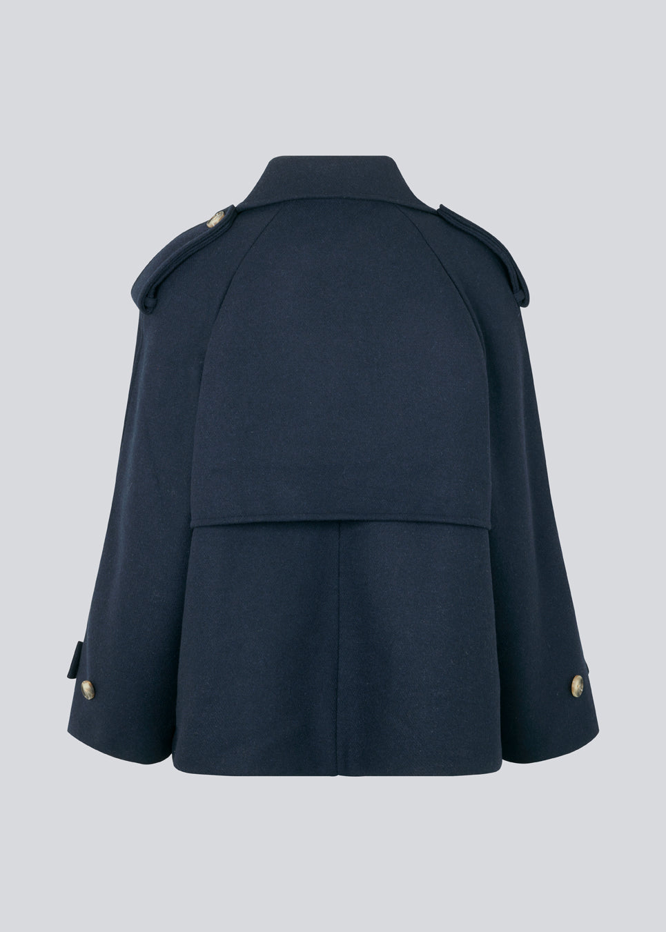 Cropped double-breasted wool coat with hidden buttons. EsmundMD jacket, in the color Navy Sky, has classic coat details with raglan sleeves and a high yoke at the back. Lined. The model is 175 cm and wears a size S/36.