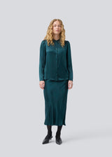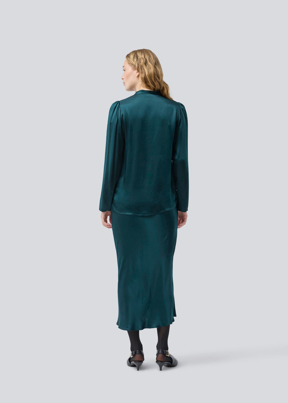 Green shirt with wide sleeves in satin. Parveenmd shirt has a front button closure. The model is 175 cm and wears a size s/36.