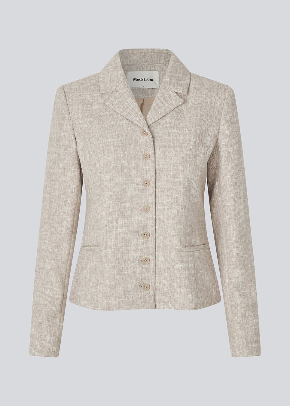 Short fitted blazer in beige melange in a structured material. KieraMD jacket has two pockets at the front and a slit at the sleeves with button closure.