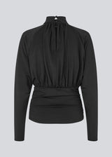 Elegant black blouse featuring a high neckline and long sleeves. Designed with delicate gathered details at the bust and waist to create a flattering silhouette. A subtle button closure at the back of the neck adds a refined and feminine touch. The stretchy fabric ensures a comfortable fit, while the draped design offers timeless elegance. Perfect for both everyday wear and special occasions.